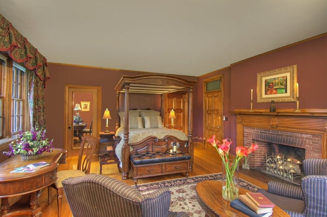 Blending elegant furnishings with modern amenities, the Castle Suite has a bedroom with Queen bed, a large decorative fireplace, a separate sitting room and a private ensuite bathroom.